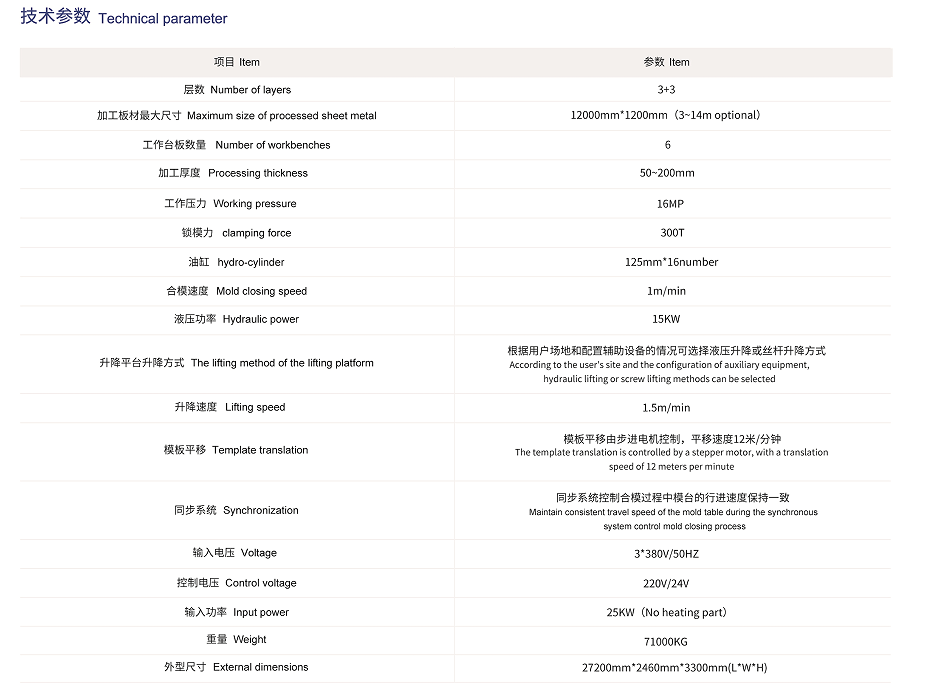 二是自動(dòng)升降平臺(tái),她的作用是從打開的層壓機(jī)工作區(qū)中將完成工作的模板取出,然后下降到適合工作的高度,再有人工或機(jī)械手將保溫板取出,然后進(jìn)行鋪裝工作,再將準(zhǔn)備好的模板送入層壓機(jī),然后在取出下一塊模板,直至將三塊模板都完成工作。